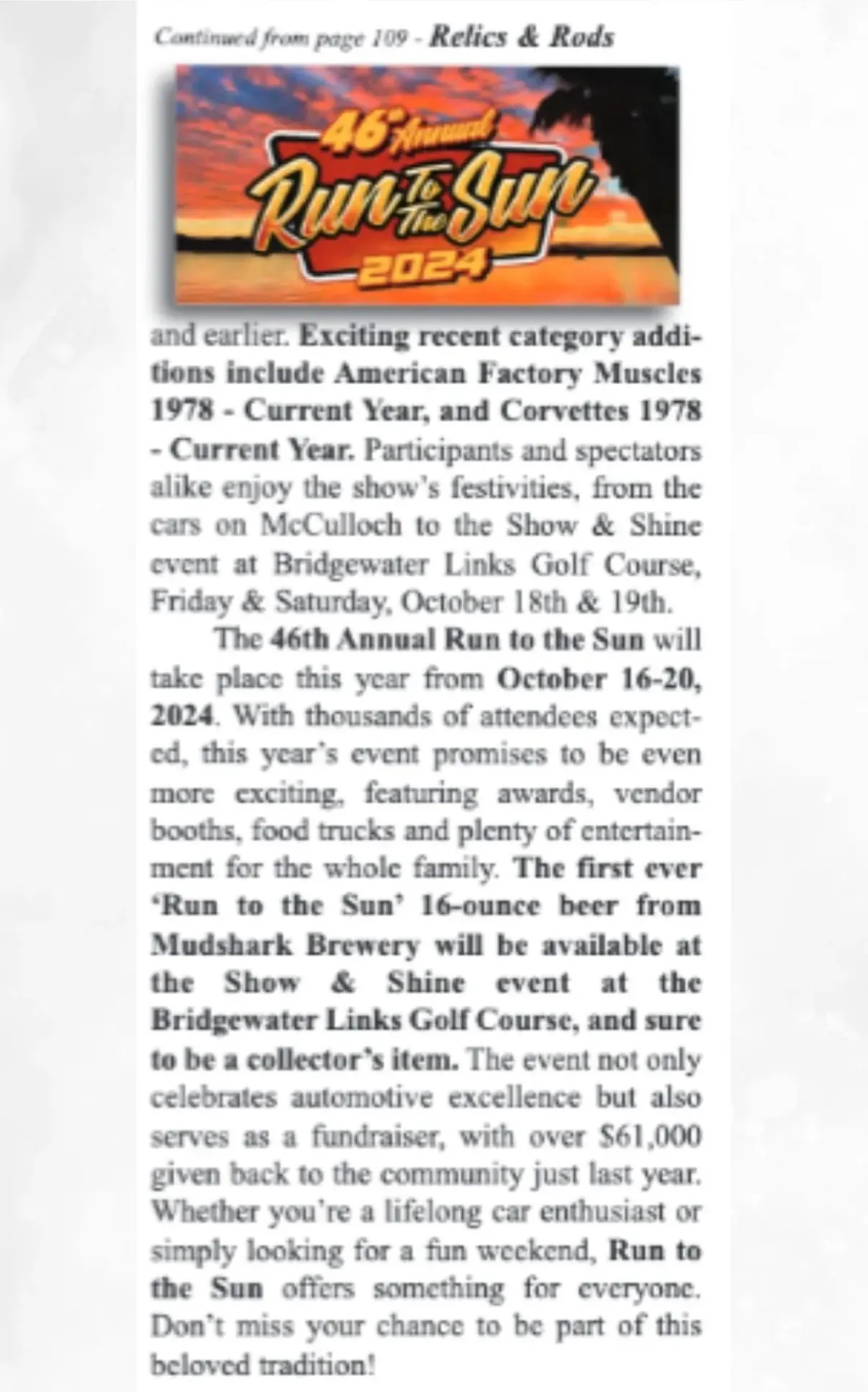 As always, proceeds from Run to the Sun support local non-profits and youth programs, continuing the Relics and Rods tradition of giving back while keeping the classic car culture alive and thriving.